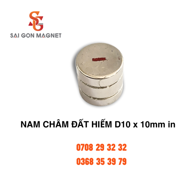 Nam châm đất hiếm D10x10mm 2 rãnh in +- có kích thước trụ D10×10: dễ khoan căn tâm, lắp âm thẩm mỹ, lực hút tốt.