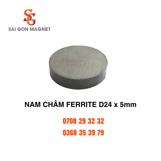Nam châm ferrite D24x5mm là loại nam châm tròn làm từ vật liệu ferrite (gồm oxit sắt và strontium carbonate). Nhờ quy trình nén ép bột và nung ở nhiệt độ cao, sản phẩm đạt được từ tính mạnh, ổn định và có khả năng kháng từ tốt.